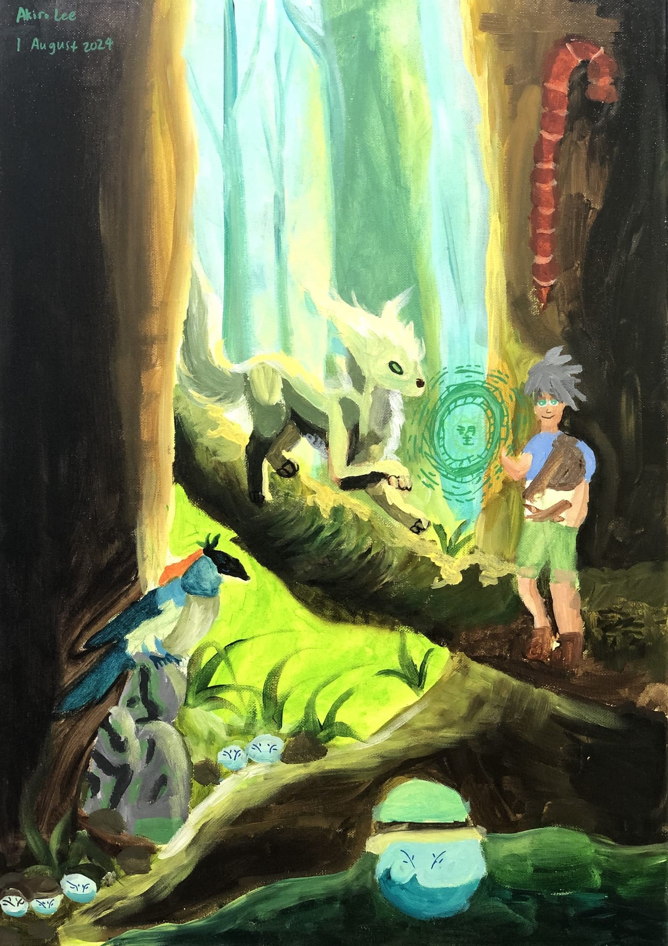 In this landscape painting, Yeo Jin Wei, 8yo learns how to draw a forest of trees, and how to make objects in the distance look visually farther away from objects in the front, by making the trees at the back lighter than those in front. She also learnt how to give the trees it textures and making the overall painting less flat. Very skillful observations demonstrated for such subject matter!
