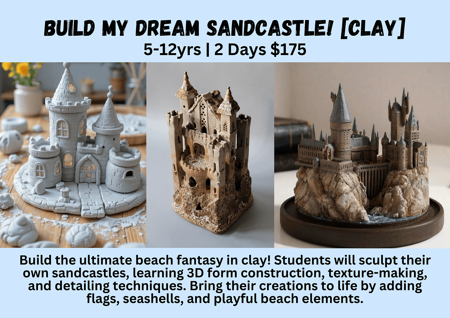 Build the ultimate beach fantasy in clay! Students will sculpt their own sandcastles, learning 3D form construction, texture-making, and detailing techniques. Bring their creations to life by adding flags, seashells, and playful beach elements.