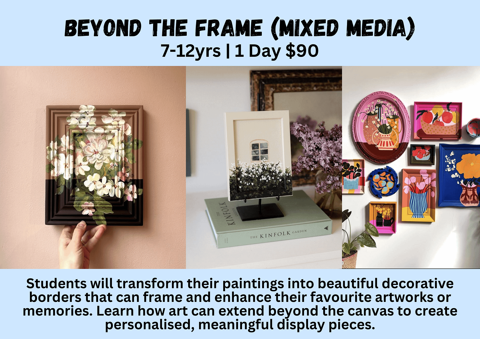 Students will transform their paintings into beautiful decorative borders that can frame and enhance their favourite artworks or memories. Learn how art can extend beyond the canvas to create personalised, meaningful display pieces.