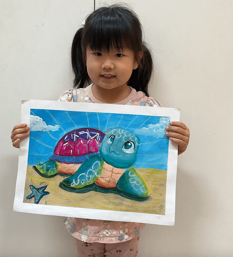 In this lessons ‘My Favourite Animal’, Matilda 4yo, tapped into her imagination from memory where she visualised the turtle on the beach and applied it to her artwork. To create textures in the artwork, Matilda used a sponge and dabbed the sky for fluffy clouds and oil pastels at the bottom for shadows. Using markers, Matilda added in the patterns for the turtle shell. Such interesting play of imagination from Matilda!